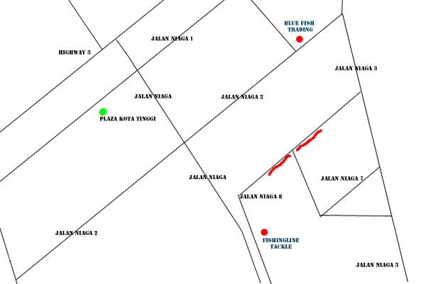 As far as I am aware there are 3 tackle shops in Kota Tinggi town. The location of the third tackle shop in my hand drawn map is mark by a red line as I can't really recall the exact location but it's one of the shop within the short stretch marked in my map.