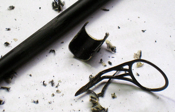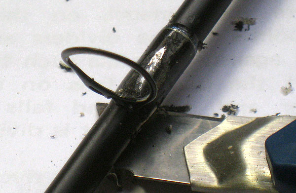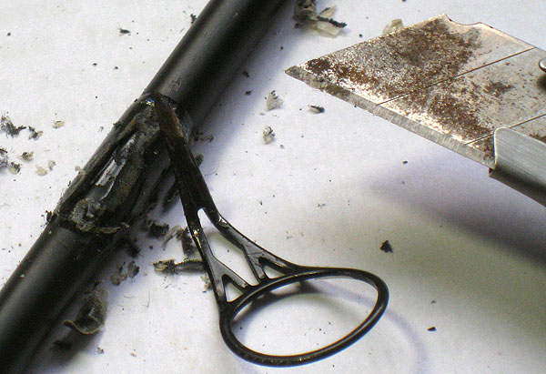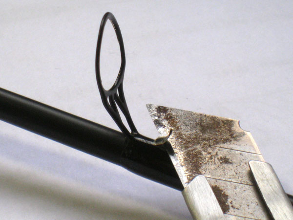 The first part of this process is removing the old guide from the rod, the guide is held in place on the rod with thread and epoxy, to remove the guide we need to cut through the harden epoxy and cut the thread holding the guide to the rod. To do that I simply uses a cutter or a pen knife and some sand paper. I usually begin my cut from the foot of the guide. Knowing that the foot is metal I can slice away at the epoxy all the way to the base to the foot and not worry that I might scratch and injured the rod blank. |