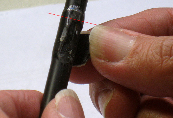 When the old guide is removed, it will leave a gash and with the gash you should be able to see the rod blank below which the old guide sits. From here, I try to use my finger nails to peel of the remaining thread wrapping the blank. Usually it comes off quite easily but other time I still need the aid of the cutter blade. If you need to use the blade, you must be careful not to scratch the blank when you peel the remaining thread off. As you can see the blank and the depth of the epoxy plus thread you need to remove, you should be able to scrap them off without much effort. Below is an image of me using my nails to peel off the epoxy and thread around the cut. |
