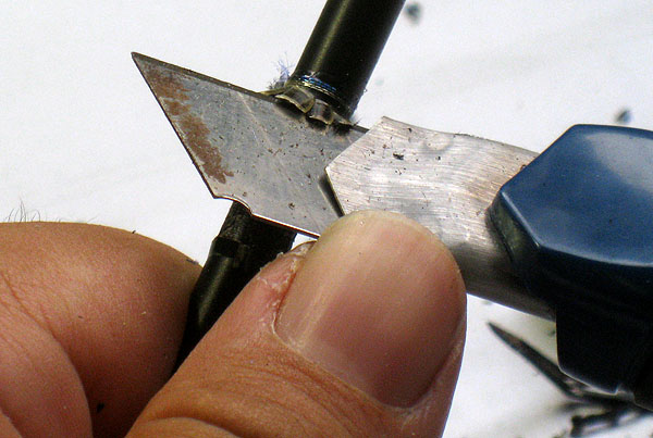 After removing the thread and epoxy around the gash, the nex part is to remove the thread and epoxy below the cut. For that I use the cutter and gently slice of the remaining thread and epoxy taking care not to scratch the blank as much as possible. Below is an image of my attempt at slicing off the remaining thread and epoxy. |