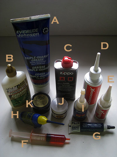 I use this as general oiling inside the reel. Before I got (item H) that is specifically design for bearings, I used this too. http://www.corrosionx.com/reelx.html |