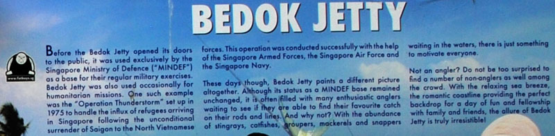 Bedok Jetty. The Bedok jetty would probably be the place where most Singaporean anglers would have visited at least once within their angling life. The jetty is located along the East Coast Park near the East Coast Lagoon and East Coast Lagoon Food Village/Centre. This location is a good place for all anglers, from those who have just started fishing to the most seasoned fisherman. There are also toilets and showers facilities nearby so it’s a great place for family fishing. And with the food centre within walking distance there is no reason to go hungry when you’re fishing there. |