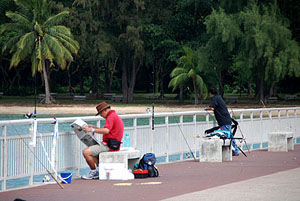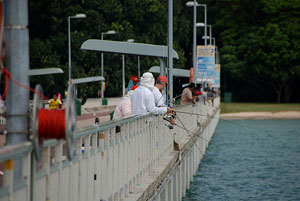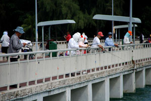 The photo to the left shows anglers fishing for Tambans, with feathered jigs. You can actually catch a huge range of fishes from the jetty if you're lucky, its possible to catch bait fishes like Herrings like Tambans, Assam Fish, Selar and some small Mackerels. Bottom fishes like groupers, grunters, sweetlips, snappers, triggers, catfish and much more have been landed. For mid water species you might get to see queenfish, diamond trevally, golden trevally, wolf herring, todaks and of course the barracudas. The jetty has also been famous for the biggies that have been landed occassionally, you could have huge rays, sharks, skates and cobia to name a few. In the night you can also see fisherman catching squids and cuttlefish. |