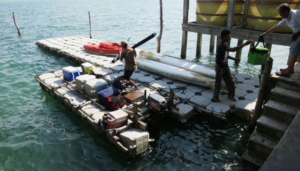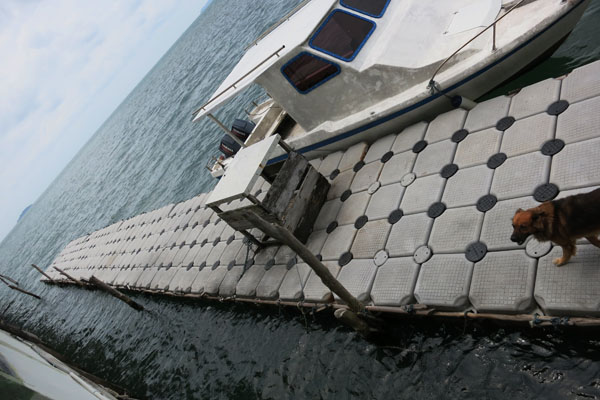 | Above is one of the platform that is use to tie and launch their boat. When we were there, they might have remove a plank or walkway so you can't really get across to fish on this platform. The dog is there to warn the owner if anyone tries to board the kelong from here. Image below is the other platform they have, you can go on it to fish if you want. And as you can see they also have kayaks and canoes available. The more interesting thing here is their makeshift boat, they use this boat to transport our luggage, ice box and other heavy stuff when we have to walk the jetty when we arrive and when we return. |