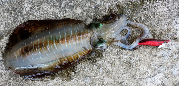 A US size 10.5 squid captured in the image below. One thing predictable about Kawal is there there will always be squid around throughout the year.