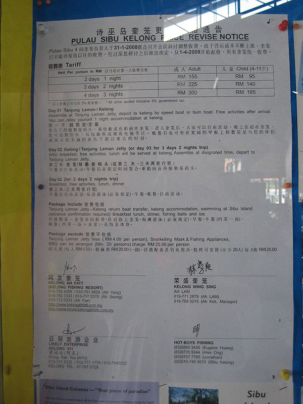| This image was taken at Tg. Leman jetty in Aug 2010, the prices and services might have change a little. Those that I am aware of are some of the kelong no longer provide ice and bait free, the jetty tax has increase. Please contact the the kelong for specific detail, this site does not represent them in anyway. The details presented here is for your information only. You should still be able to see this poster at the jetty if I am not mistaken. |
